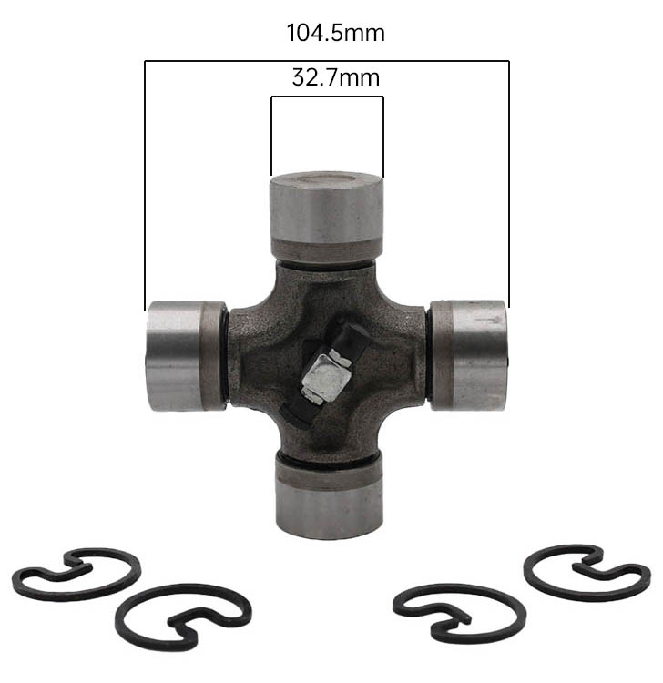 The driveshaft universal joint (technical name: Universal Joint Cross Shaft) is a key component in the automotive transmission system. Its core function is to achievevariable-angle power transmission, ensuring stable power transfer between the driveshaft, transmission, rear axle, and other components. During vehicle operation, the transmission and rear axle experience relative displacement due to bumps or steering, the universal joint allows adjacent shafts to pivot within a range of15°~20°, ensuring continuous power transmission. Its cross-pin hinge structure absorbs vibrations from the transmission system, protecting other components from impact. Some models come with grease fittings and require regular lubrication to reduce wear. If the universal joint is damaged, it may cause abnormal noises, power transmission interruption, etc., requiring timely maintenance or replacement.